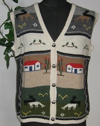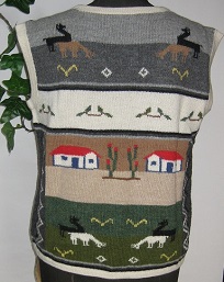 インタルシア ベスト [ Cdo.fol-101 ] アルパカ100%(スーパーファイン) オフホワイトがベース エリは着やすいVカットです アンデスの風景を編込みました フォルクローレ調の逸品 ベストは人気のアイテムです |