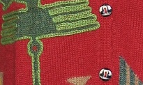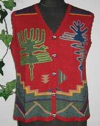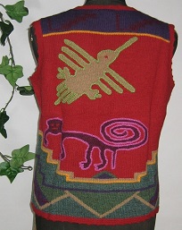 インタルシア ベスト [ Cdo.fol-104 ] アルパカ100%(スーパーファイン) 赤色がベース エリは着やすいVカットです ナスカの地上絵を編込んでます フォルクローレ調の逸品 ベストは人気のアイテムです |