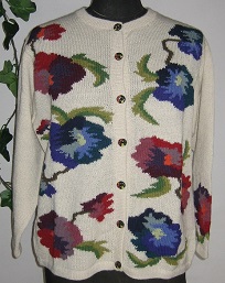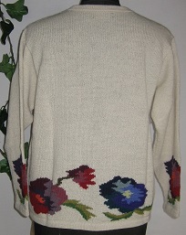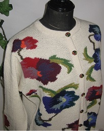 インタルシア カーデガン [ Cdo.kde-05 ] アルパカ100%(スーパーファイン) ベースはオフホワイト エリはラウンドタイプです 色とりどりの花を編込みました 広い年齢層の方にお召しいただける 逸品です |